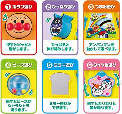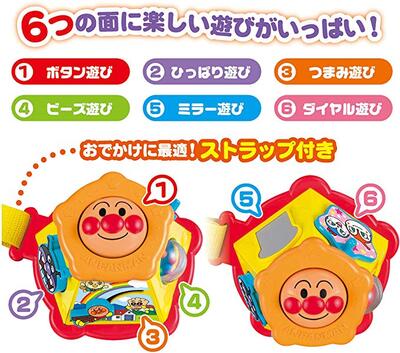 特徴 ・外出時にも大活躍! ミニサイズのよくばりボックスが登場! ・つかむ、押す、回すなど発育を促す遊びがぎっしり! ・指先遊びと音遊びがいっぱいです! ・アンパンマンを押すとピッピと音が鳴ります! ・ばいきんまんを引っ張ると伸び縮みします! ・ドキンちゃんのダイヤルを回すとカリカリ音が鳴ります! ・アンパンマンを動かして遊べます! ・透明ドームをクルクル回すとビーズがシャラシャラ鳴ります! ・ミラー遊びができます! ・持ち運びに便利なストラップ付き! ・付属のストラップでバッグやベビーカーに付けられます! ・電池不要なのですぐに遊べます! ★